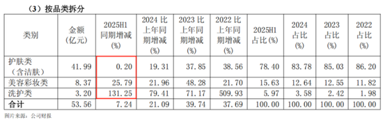 营收增幅下滑的主因很大程度上是核心护肤品收入增长陷入停滞。今年上半年,公司护肤品的收入为41.99亿元,同比增长仅0.2%;其中贡献了公司约74.27%收入的核心品牌珀莱雅收入为39.79亿元,同比下滑0.08%。
